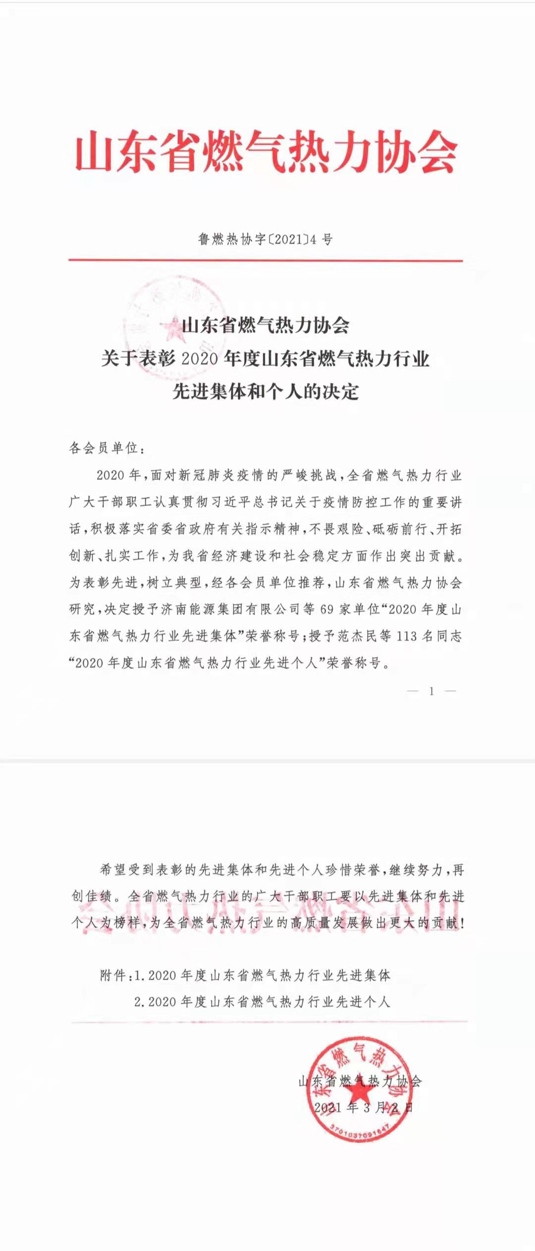 3月2日,我公司被山東省燃?xì)鉄崃f(xié)會(huì)評(píng)為2020年度山東省燃?xì)鉄崃π袠I(yè)先進(jìn)集體榮譽(yù)稱號(hào)。